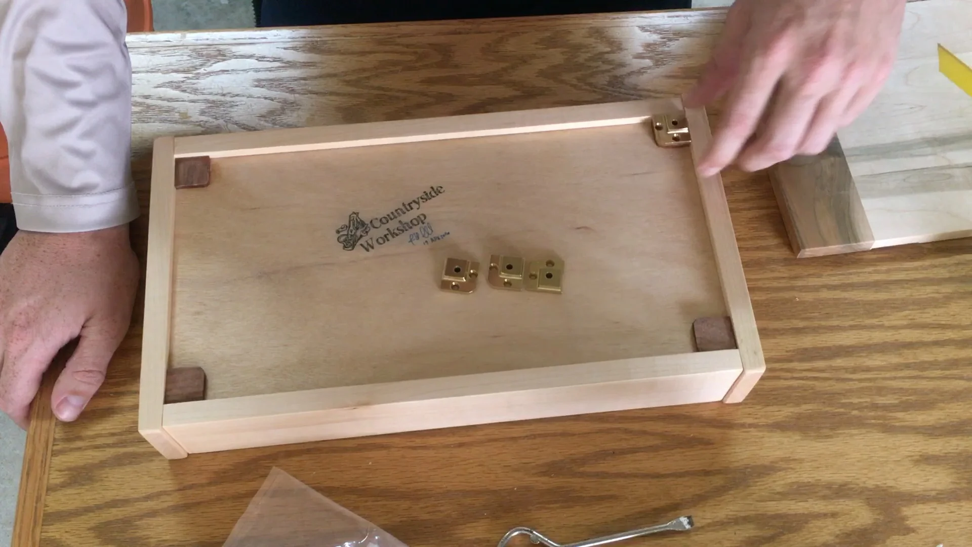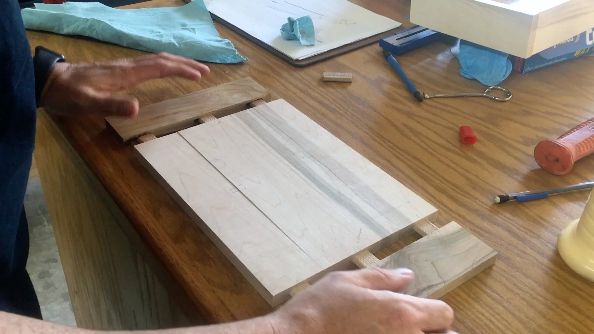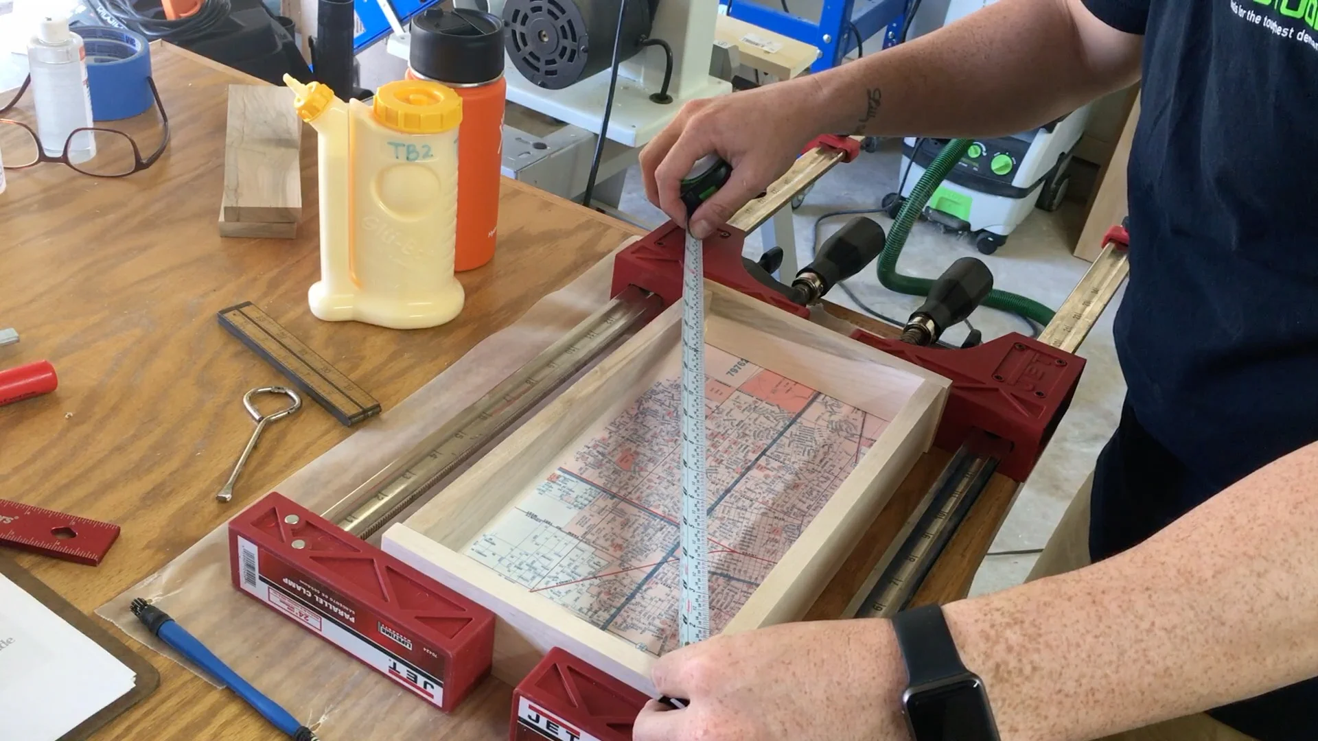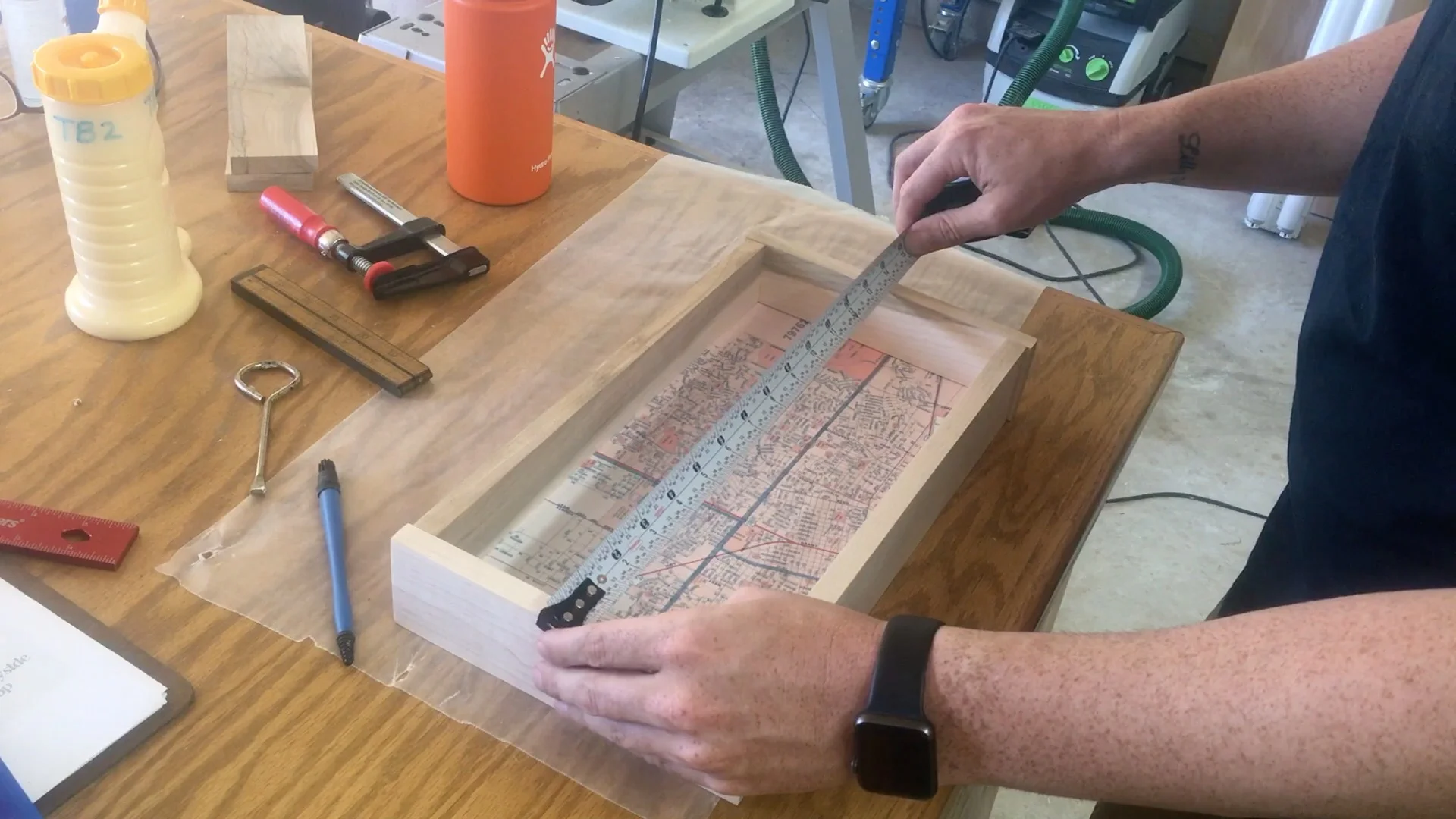 Once the bottom is dry I sand all the parts to 220 grit and then assembly. Once the box is in clamps then I measure diagonally on both sides to ensure it is square.
