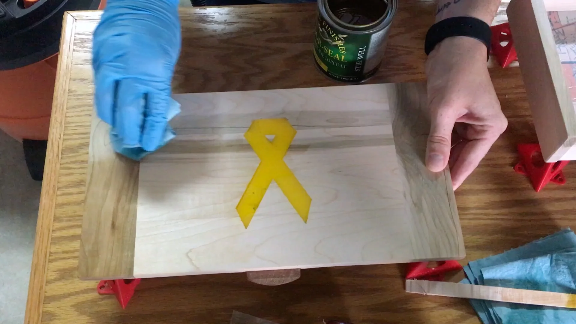 It is finally time to apply my finish of choice on this... I like to use General Finishes Arm-R-Seal. I wipe it one with a blue shop towel and then let it dry. Between each coat I sand lightly with 320 by hand to remove the dust nibs and to give the next coat something to bind too.
