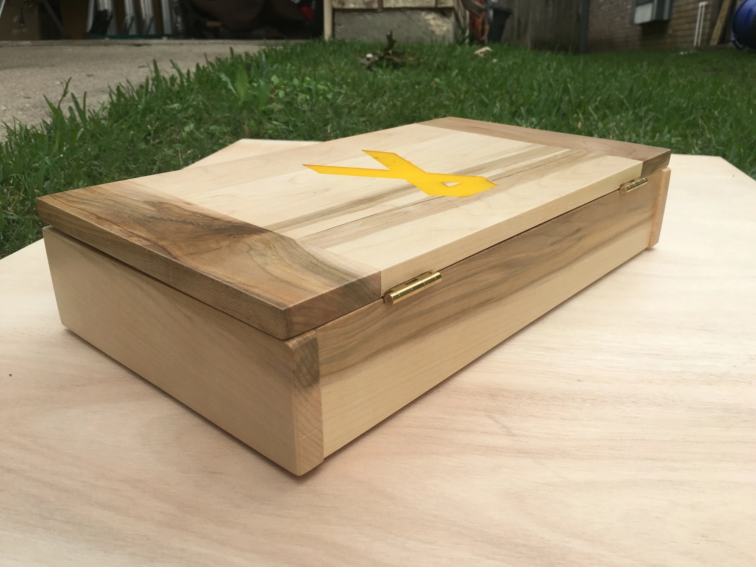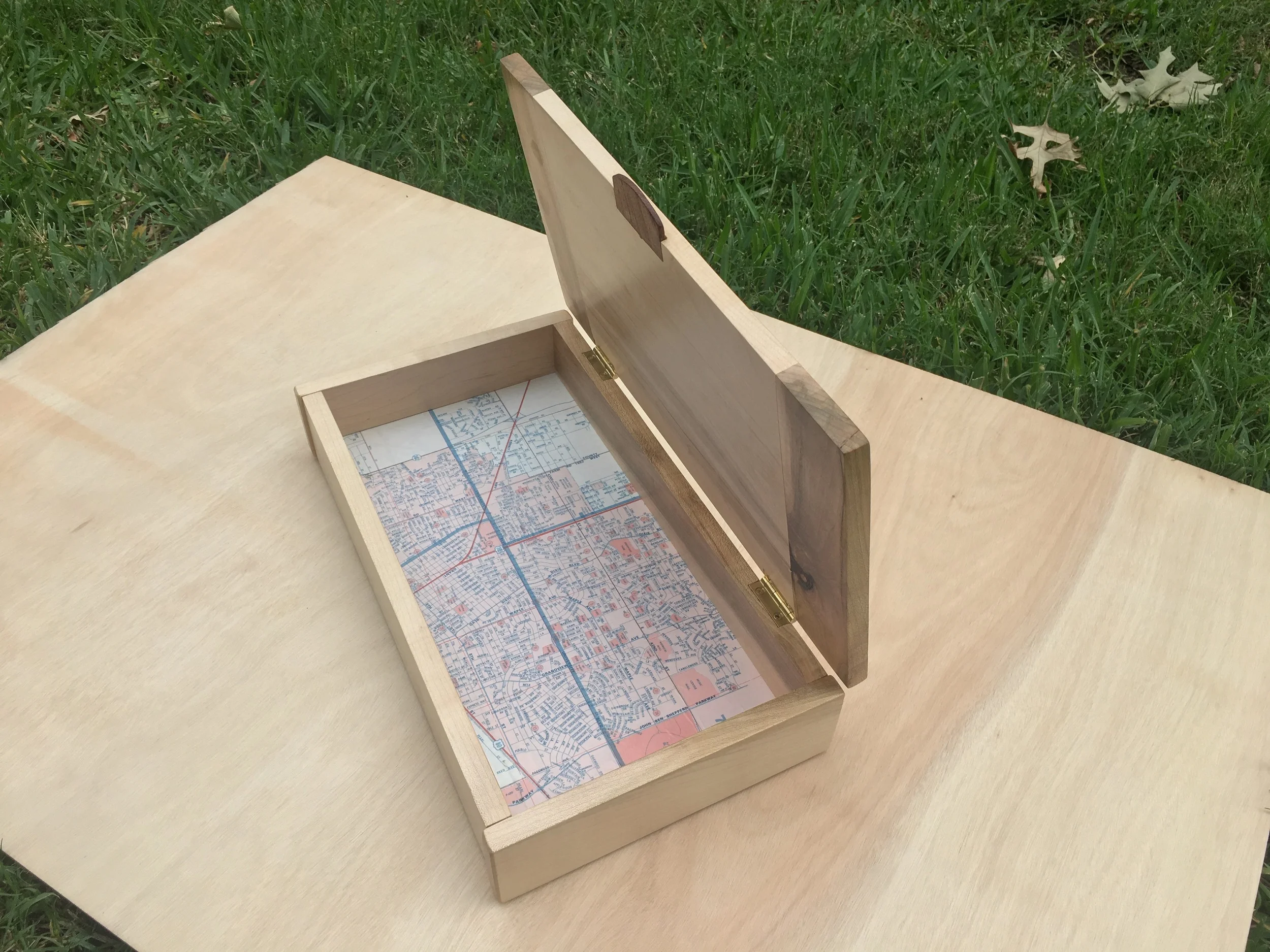 After spending the last 12 years in the military I have created a lot of memories, some tangible and some not so tangible. It seems like everywhere I turn in my house I am finding items that I kept for memories. I finally decided it was time to build a little memory box to hold all those treasures. I wanted a design that had meaning behind it. So for the bottom panel I adhered a 20 year old map of my home town, Odessa, TX. I positioned the map to show the parts of the city I spent most of my time growing up. For the lid I did an epoxy resin based inlay of the Support the Troops Awareness Ribbon. Thanks to TransTint for supplying me with the dye necessary to tint the epoxy. Since this box was going to have meaning behind it, I couldn't use cheap hardware store hinges, I looked to my friends over at Brusso Hardware to supply me with some awesome brass hardware.